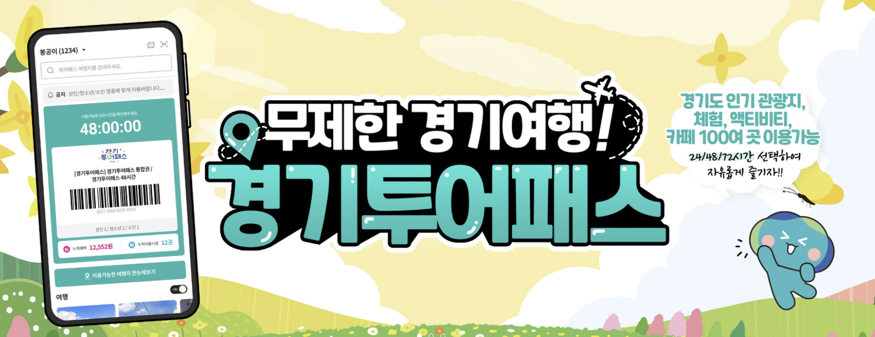 경기투어패스도 있는데, 정해진시간(24시간/48시간/72시간)동안 경기도 전역 120여곳의 여행지를 자유롭게 이동하여 즐길수있는 모바일 이용권도 있습니다.